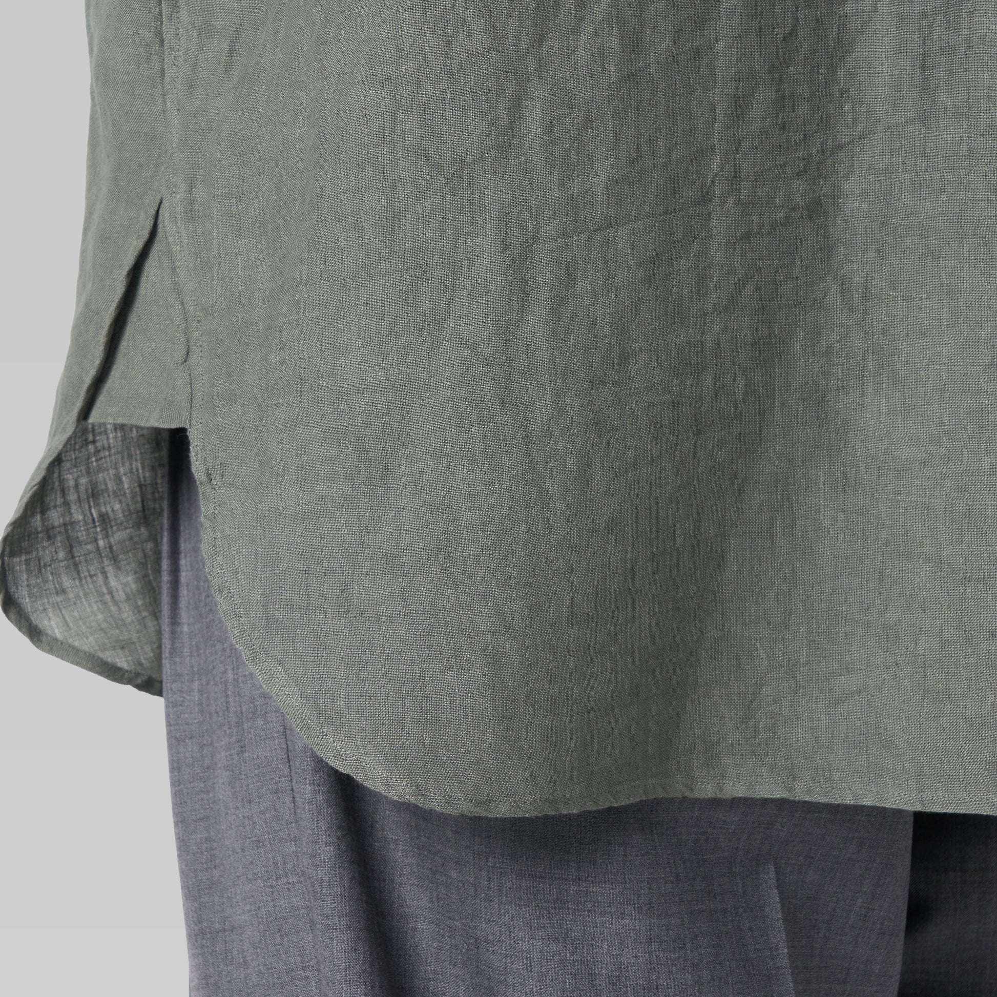 The 1/60 European linen used in this shirt is woven in Hamamatsu, known for its exceptional quality. The fabric undergoes dyeing using traditional techniques unique to the Enshu region and is finished with sun-drying in strong winds and abundant sunlight, ensuring a luxurious result. This linen offers superior breathability and moisture-wicking properties, making it ideal for hot weather, while its durability ensures it can be cherished for years. The craftsmanship of the Enshu artisans and the natural elements used in the process result in a linen material that stands out for both its aesthetic beauty and long-lasting durability.